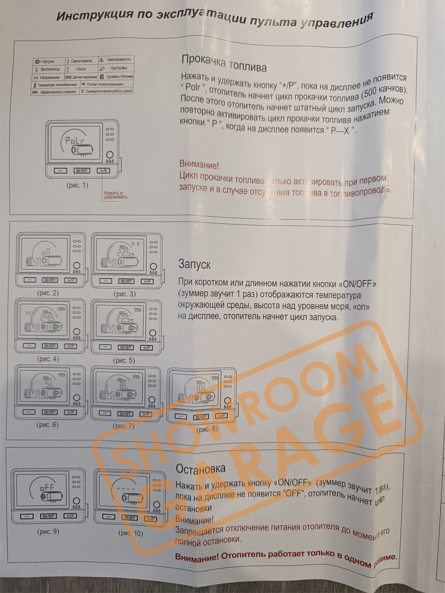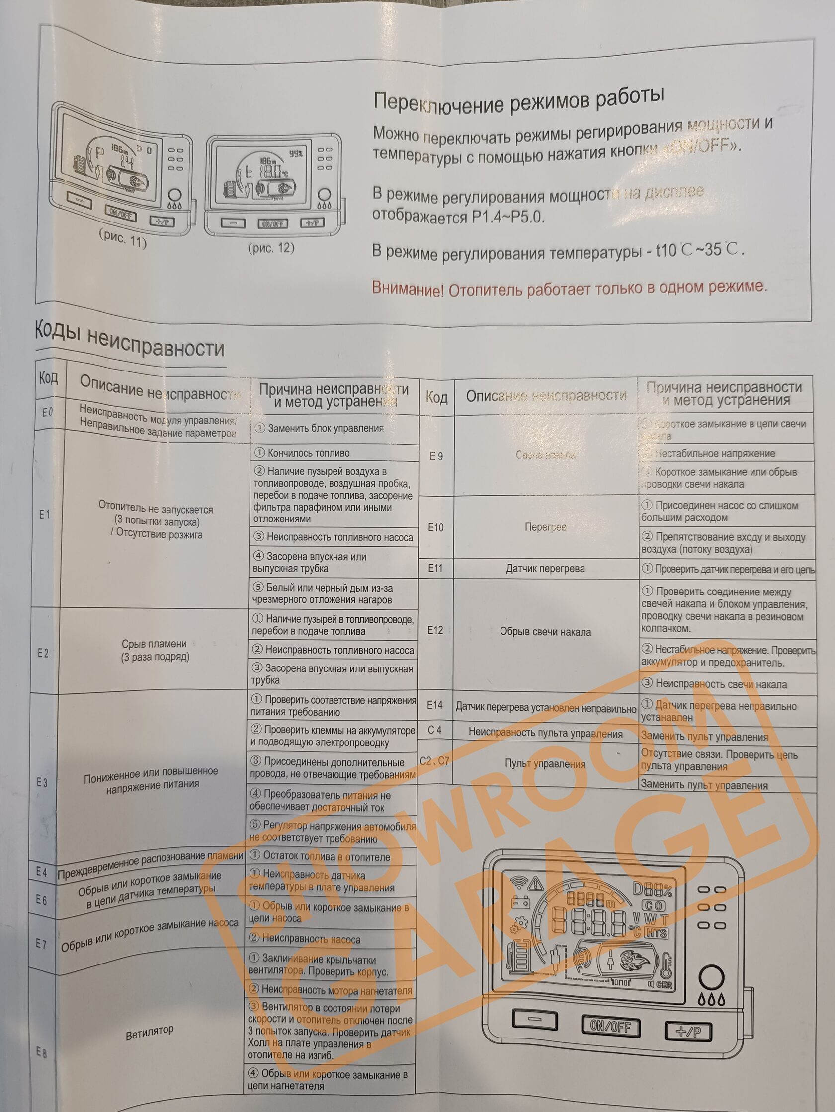 Инструкция на русском языке . 2 пульта управления ( механический и электронный). Режим теплового потока: Автоматический/Ручной Мощность (Вт) : 5000 Расход топлива (л/ч): 0,15- 0,55 Рабочая температура -45°С - +40°С. Номинальное напряжение: 24V Топливо: Дизельное топливо Бак 10 литров. Габариты (мм) : 425*148*162. Вес отопителя 5.75 кг.