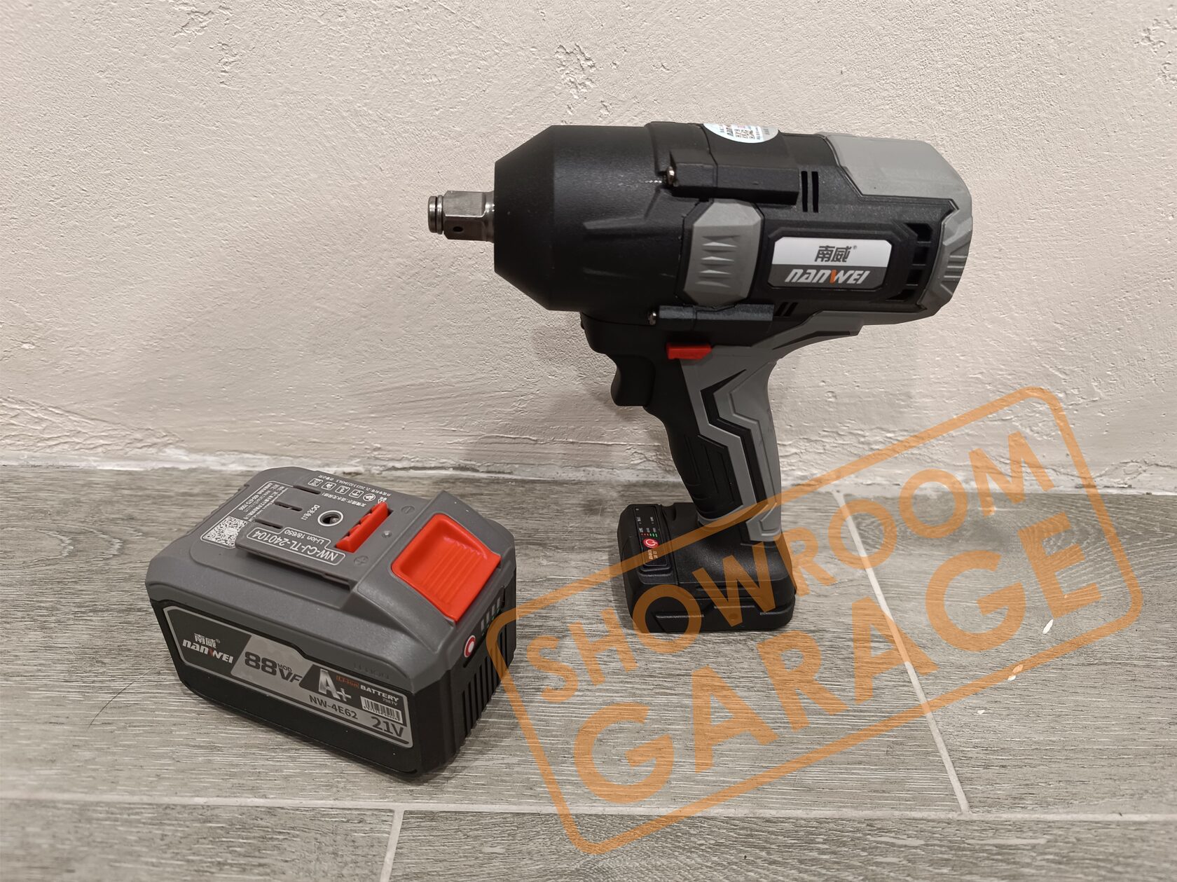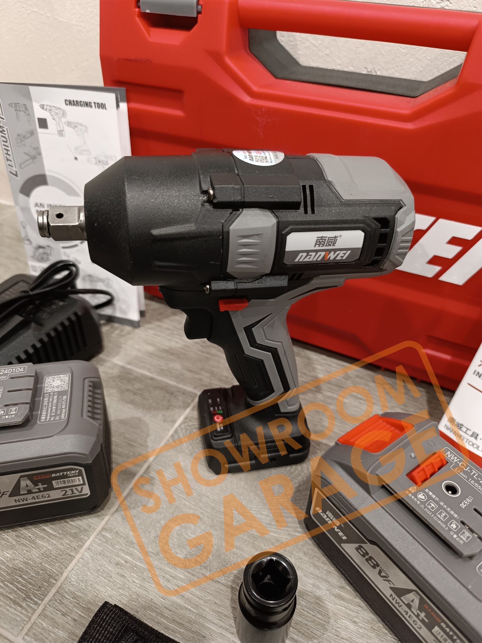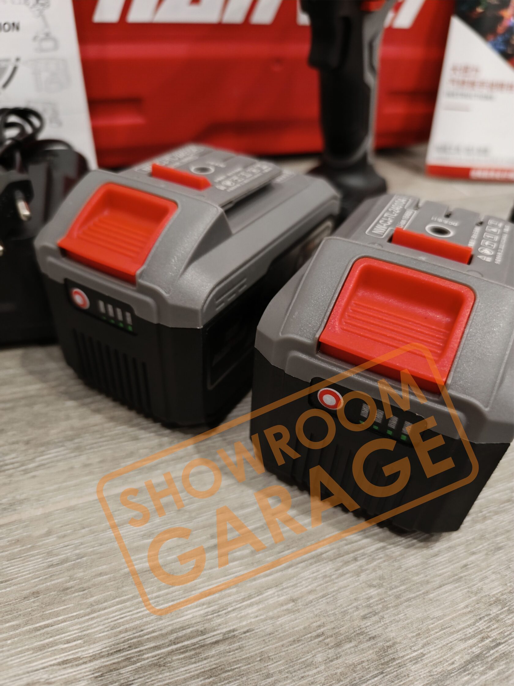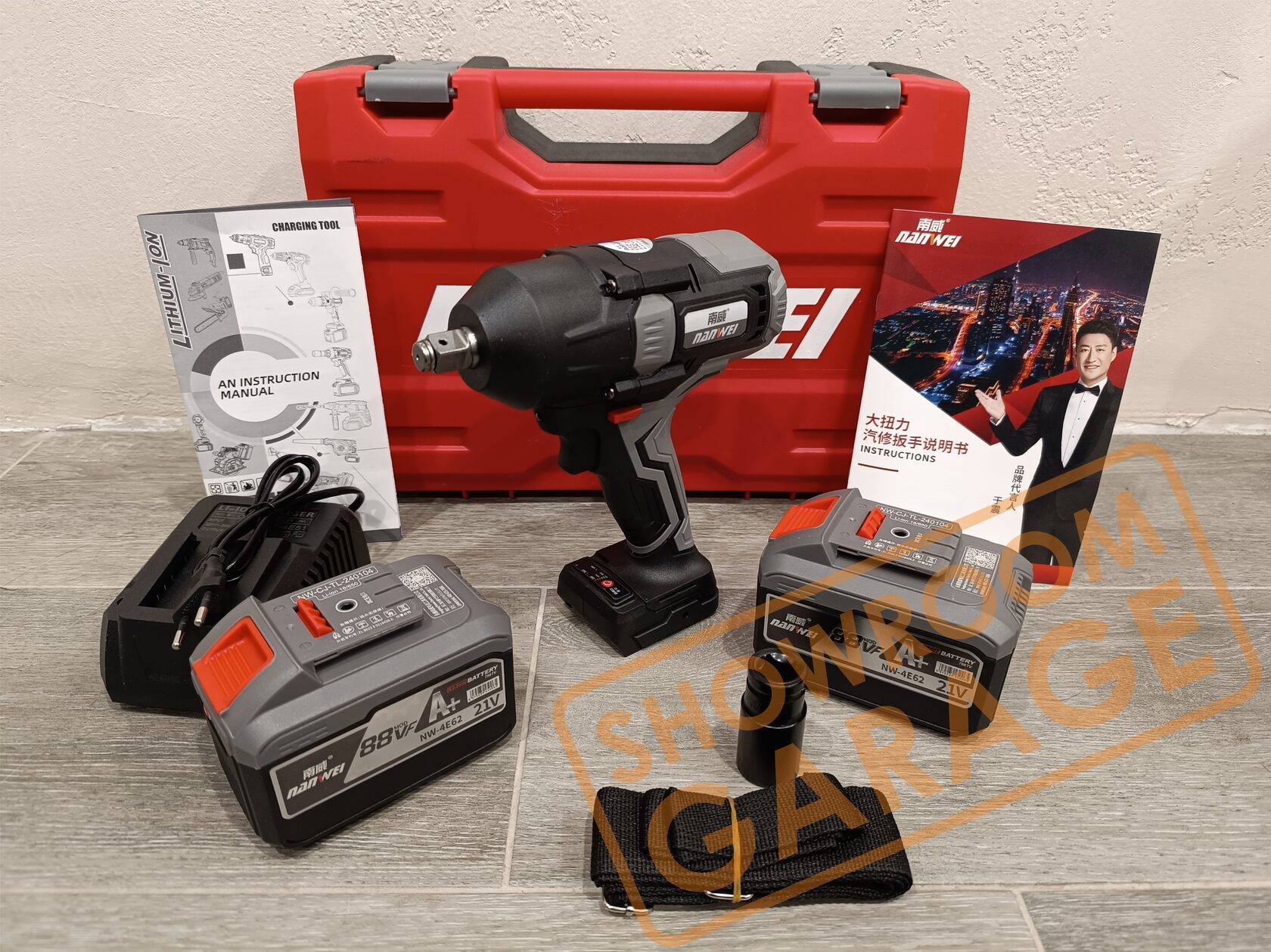 Комплектация: Гайковёрт, Два аккумулятора, Зарядное устройство, Головка, Ремень, Кейс